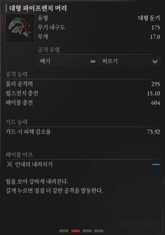 또, 무기별로 공격 유형, 무게, 치명률, 펄스전지 충전, 페이블 충전, 가드 능력 등 여러 스펙이 다르기에,